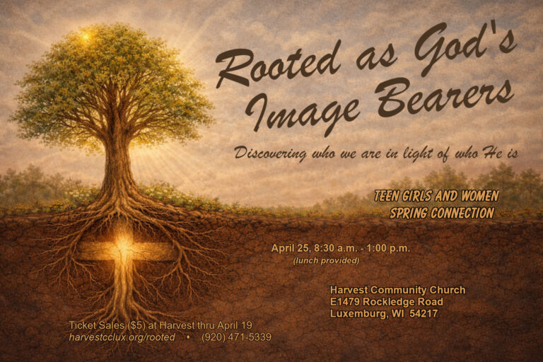 Come, be encouraged in God's Word to see yourself as God's image bearer.  We will have an insightful time of Bible discovery, cultivating lasting friendships and eating delicious food.  The event will take place Saturday, April 25 at Harvest Community Church.  Tickets are $5.